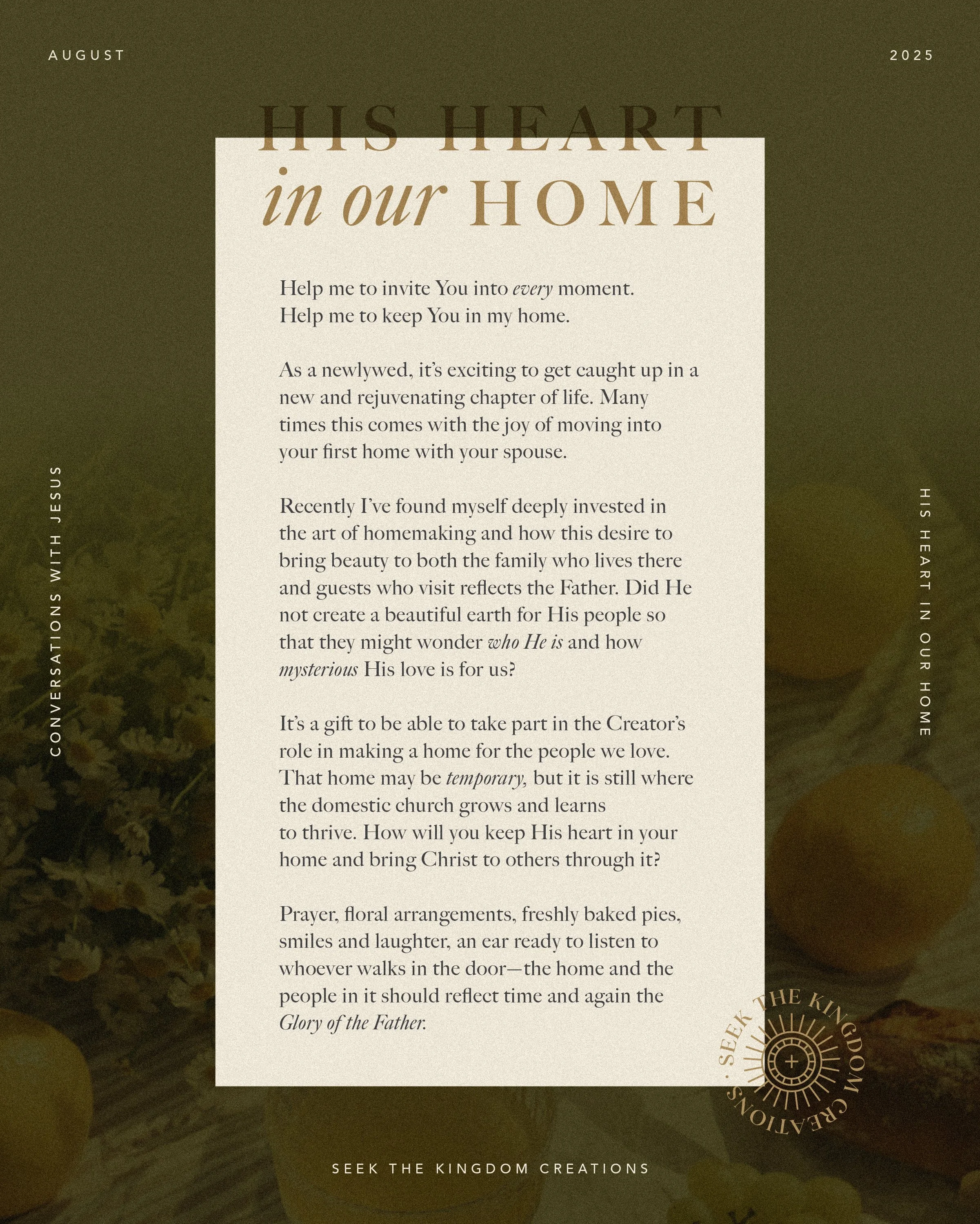 By admiring and capturing the beauty of living, I hope to invite others to see the sacred woven into the ordinary—to create moments of wonder where they might notice and behold the True God. Seek the Kingdom Creations is a passion project that hopes to reflect the Divine in the beauty around us.